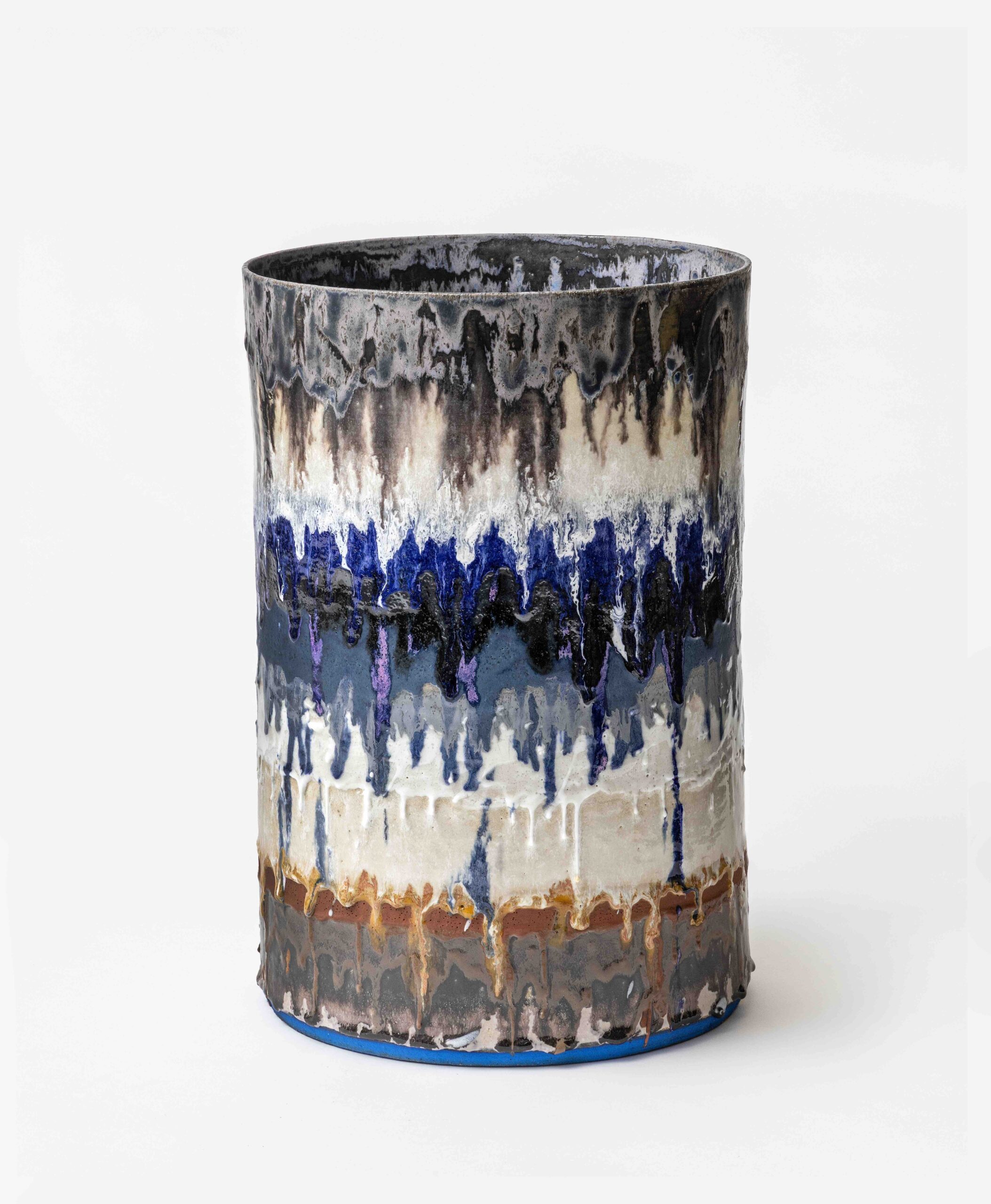 The cylinder’s precise proportions and stability are challenged by the ceramic process, where time, temperatures, and firing are never entirely controllable variables. This process can be sensed in Espersen’s works – not as a narrative of their making, but as a presence within the material. The surface speaks of the handling of the clay, while the colors bear witness to the movement of the glaze and the unpredictability of the firing. The simple form does not appear as an enclosed ideal, but as a living materiality in which chance and reactions remain visible.