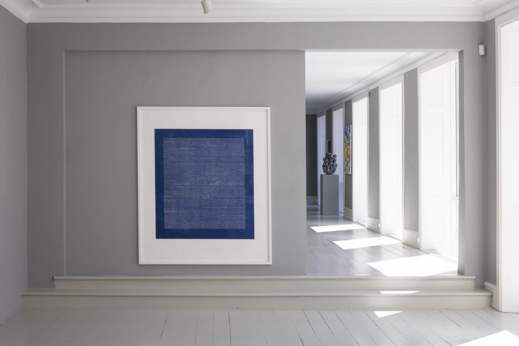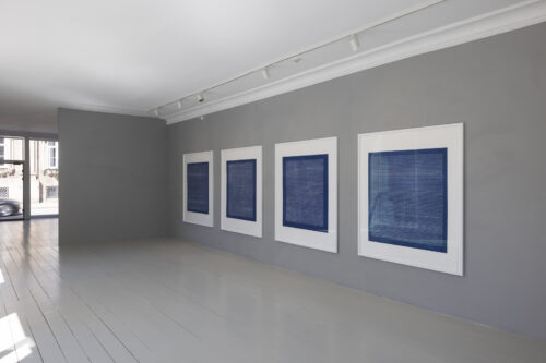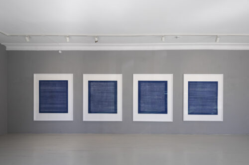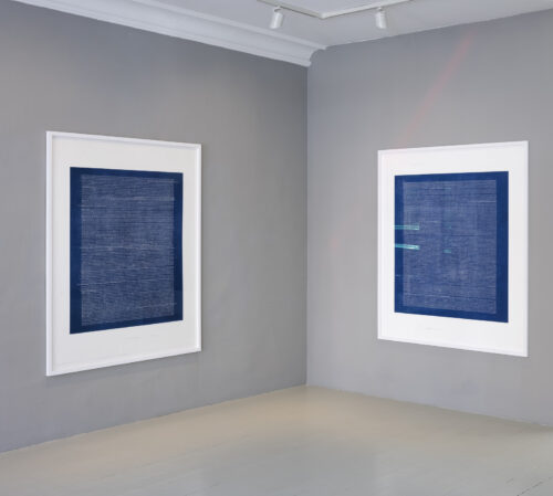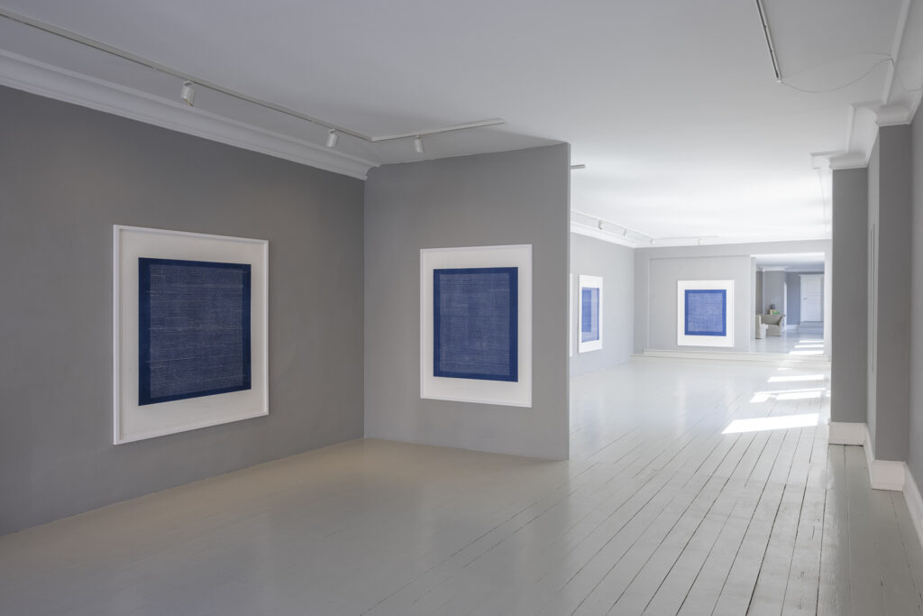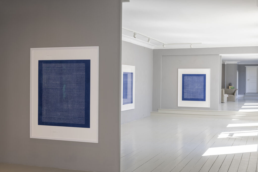 In the new version of Woodbeds, brimming, Ester Fleckner pushes the format to it’s limit. The enormous scale of the series is the largest possible which the artist’s body can span and that the printing press can accommodate. Where the series previously referred clearly to text, this shift in scale makes the new works take on a different and more corporeal character. They resemble woven ultramarine blue carpets – or a kind of beds, as the title seems to suggest.