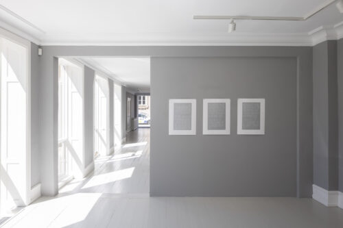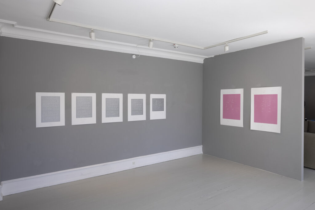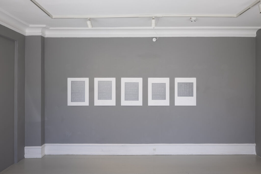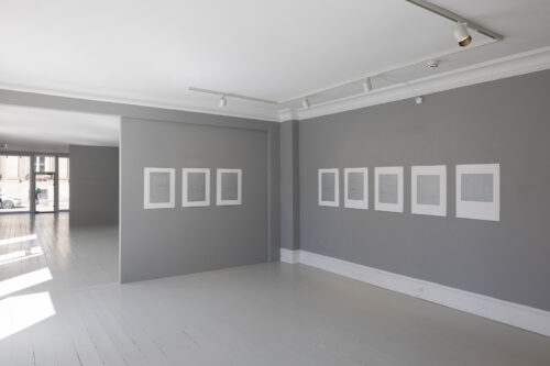 The title From one to many, many to many, and between two points to the artist’s material and formal investigations of repetition, seriality and deviations. Fleckner works with the woodcut in a minimalist style, in which the same figures appear in linear sequences that are repeated again and again down the paper. During the hand’s work with the cut, the figures slowly change, and small shifts and interactions create a tactile variation in the otherwise uniform graphics.