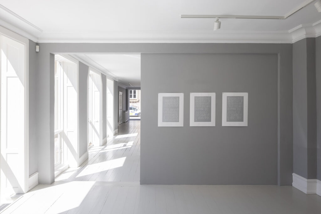 Woodbeds, brimming is initially read as a text with a clear direction from left to right. The geometric signs – triangles and pentagons, respectively – resemble a kind of abstract, yet alien language, but a language which is open, poetic and without any immediate semantic references. Rather, they point to rhythms and shifts in the open field that lies between the sign system and the body, between the industrial printing process and manual labor, and between the tight geometry that surrounds us in architecture and linguistics and the body’s reluctance to submit to binary frames.