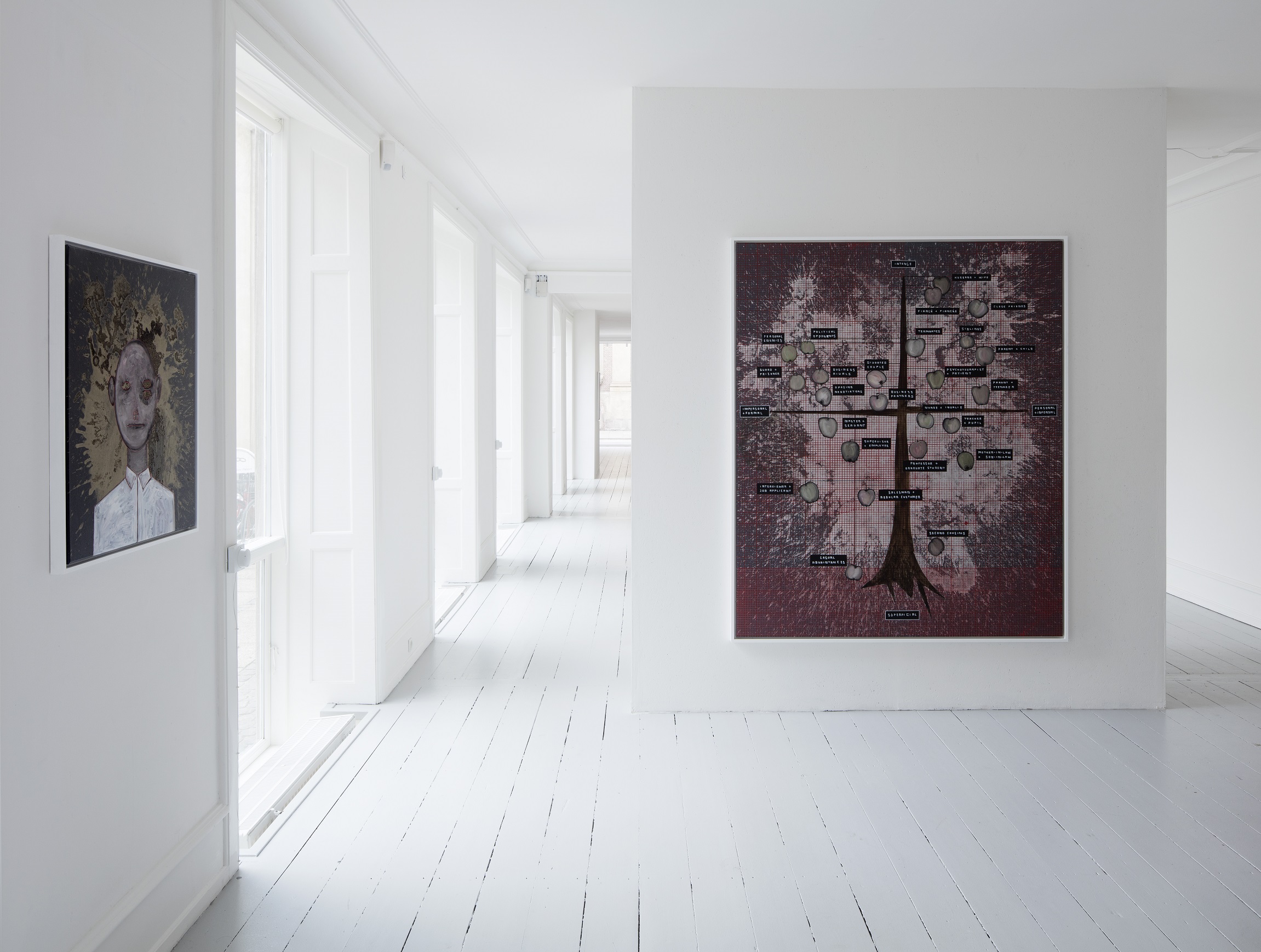 For Of the other tomorrow, he experimented with pigments like Aluminium and Magnesium to achieve certain colour effects. In his paintings Zipp is working with different techniques he brings together in a sort of layering, which also visualizes the different theoretical matters he integrates in his work. A few large-sized paintings of abstractions of classical motifs such as trees, buildings, landscapes are flanked by a series of portraits. In some of the paintings a silkscreened grid in the background is visible. By combining figurative elements with mathematical models, Zipp is reflecting the scientific approach of psychophysics to acquire mental phenomenons and interhuman relations with systematical measurement methods and rasters.