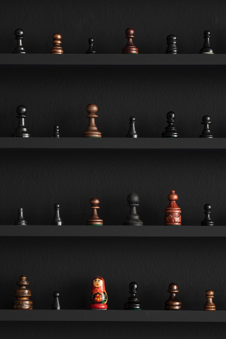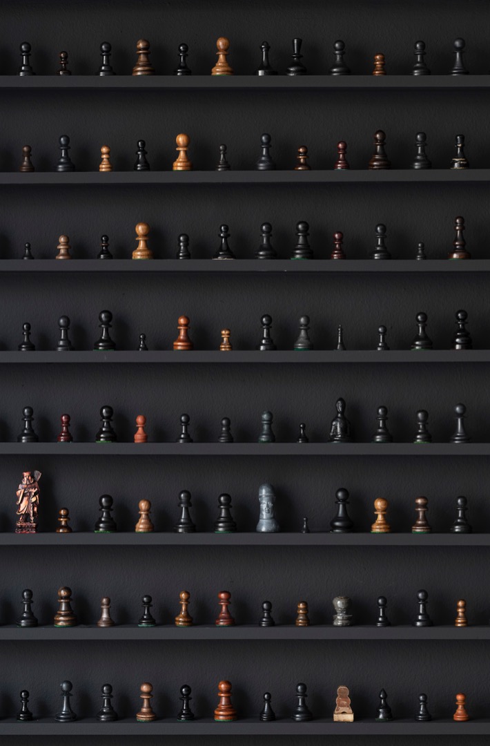 Berlin-based artist Gregor Hildebrandt (b. 1974 in Germany) addresses systems of culture production and culture mediation. In particular, materials from the culture industry, such as records, audio tape, video cassettes or celluloid, are combined in minimalist installations that open up new layers of perception for these familiar media. In Avlskarl Gallery, this artist now presents his collection of black pawns. Usually worthless “cannon fodder” in chess, these black figures from all around the world gather here to form a vibrant cosmopolitan ensemble.