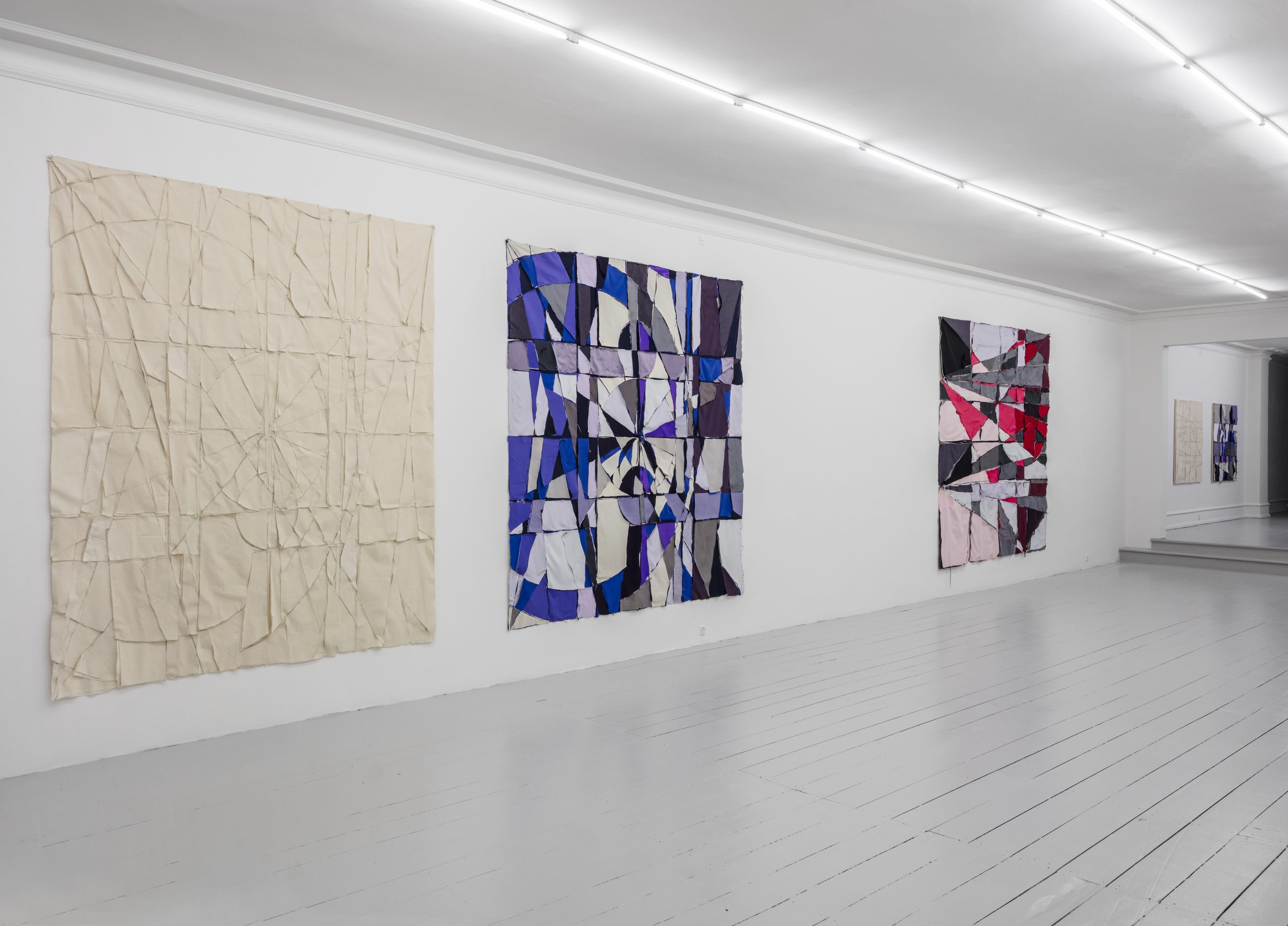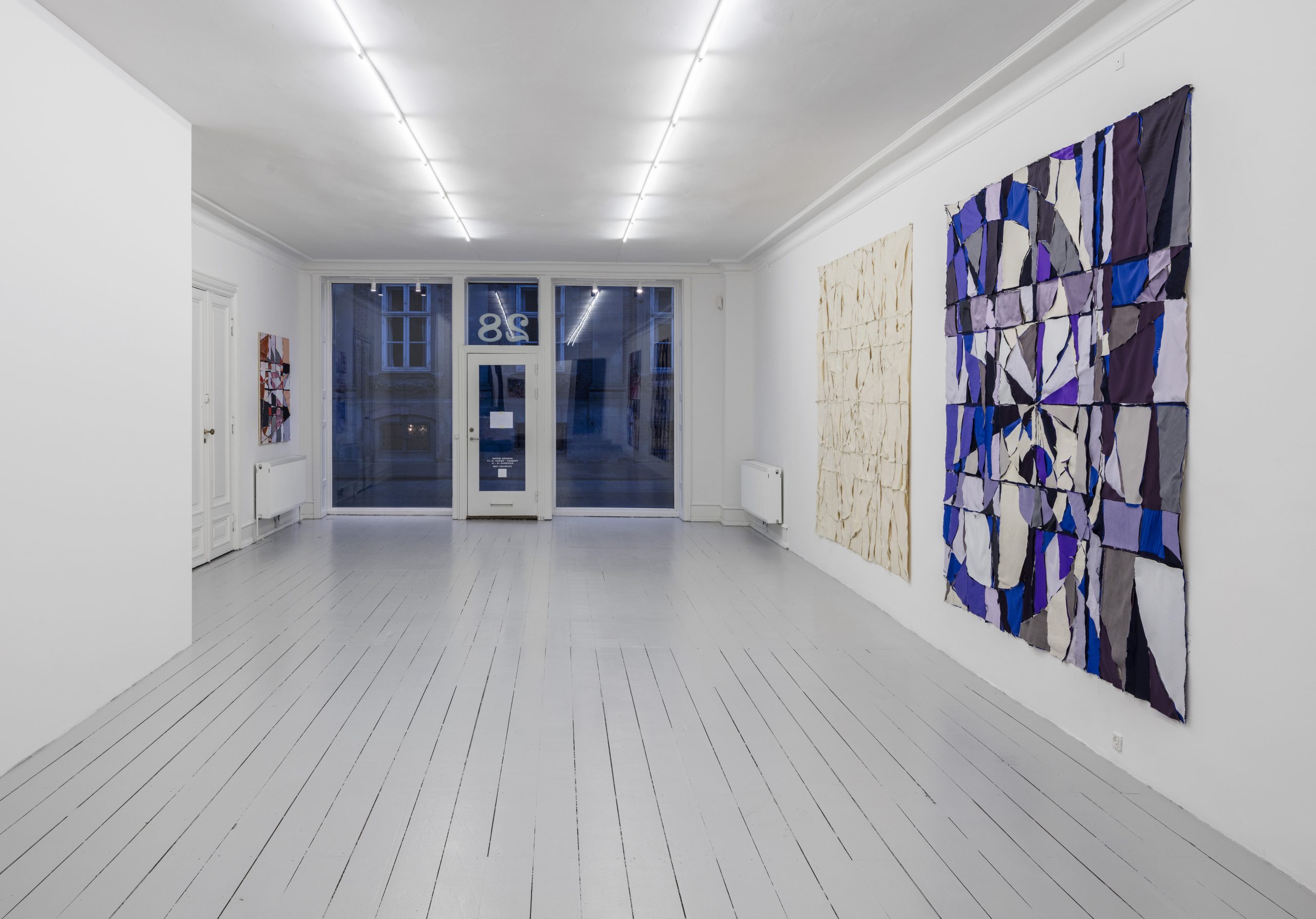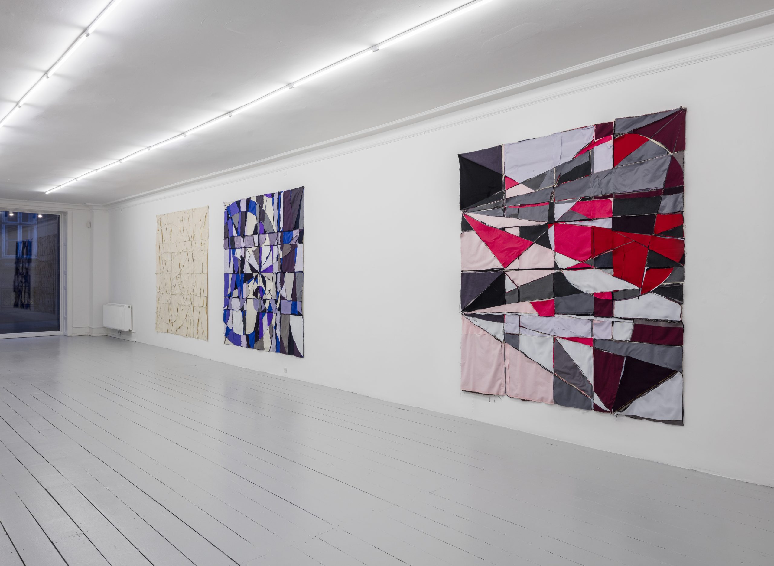 I udstillingens værker er stykker af allerede bearbejdet, vævet og indfarvet stof klippet og revet ud af sin oprindelige sammenhæng, for derefter at blive samlet i en ny sammenhæng, en konstruktion, der tager udgangspunkt i en form for grid. Dette grid er dannet ud fra det enkelte værks eget mål og i hvert værk håndteres dette udgangspunkt forskelligt. Collagernes overflade lader ingen tvivl tilbage om netop håndens fysiske nærvær. Folder, flossede kanter og lagdelte opbygninger afstedkommer og manifesterer rytme og repetition, og I udstillingens både mindre koncentrerede og større monumentale værker rækkes ud efter hele kroppen.