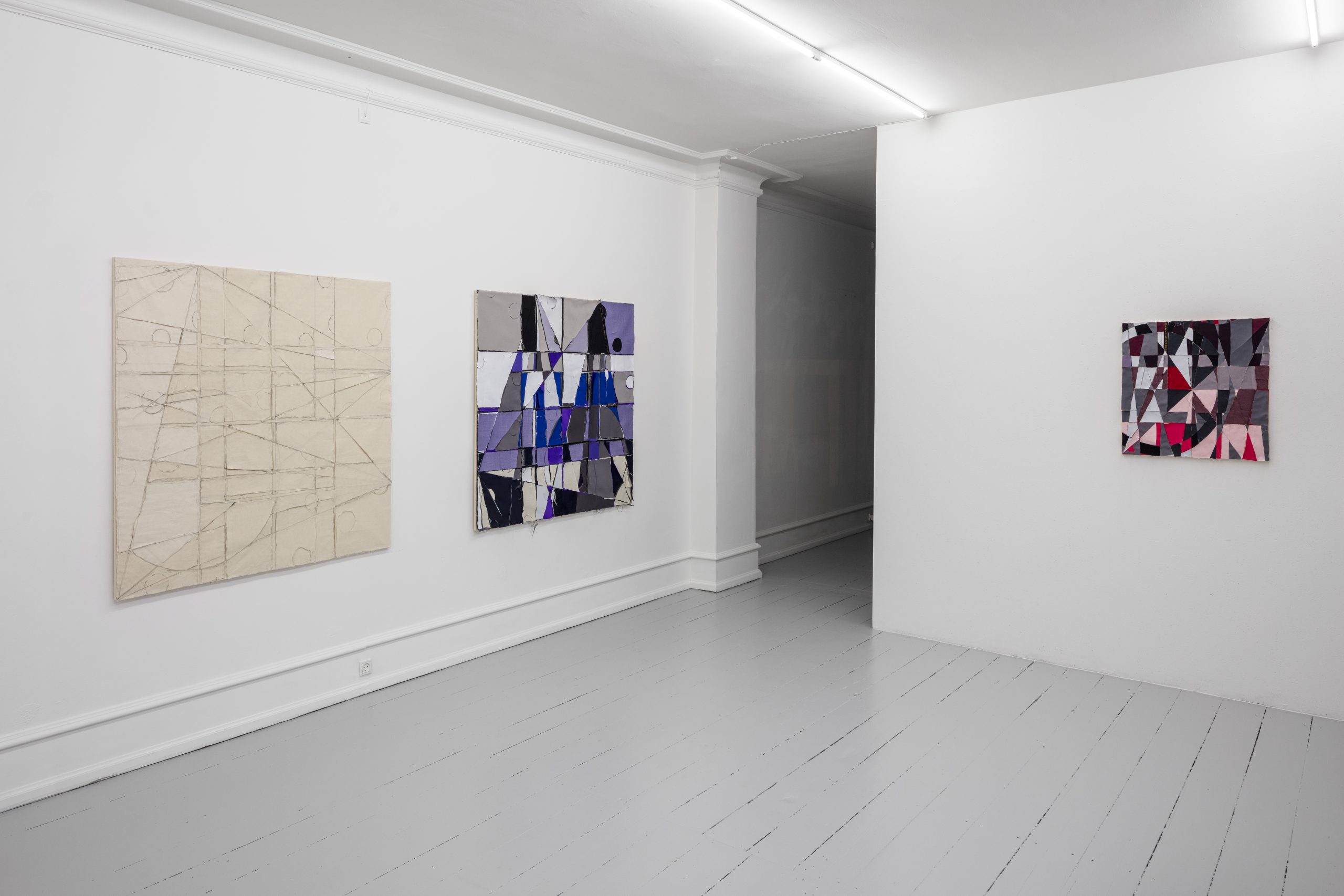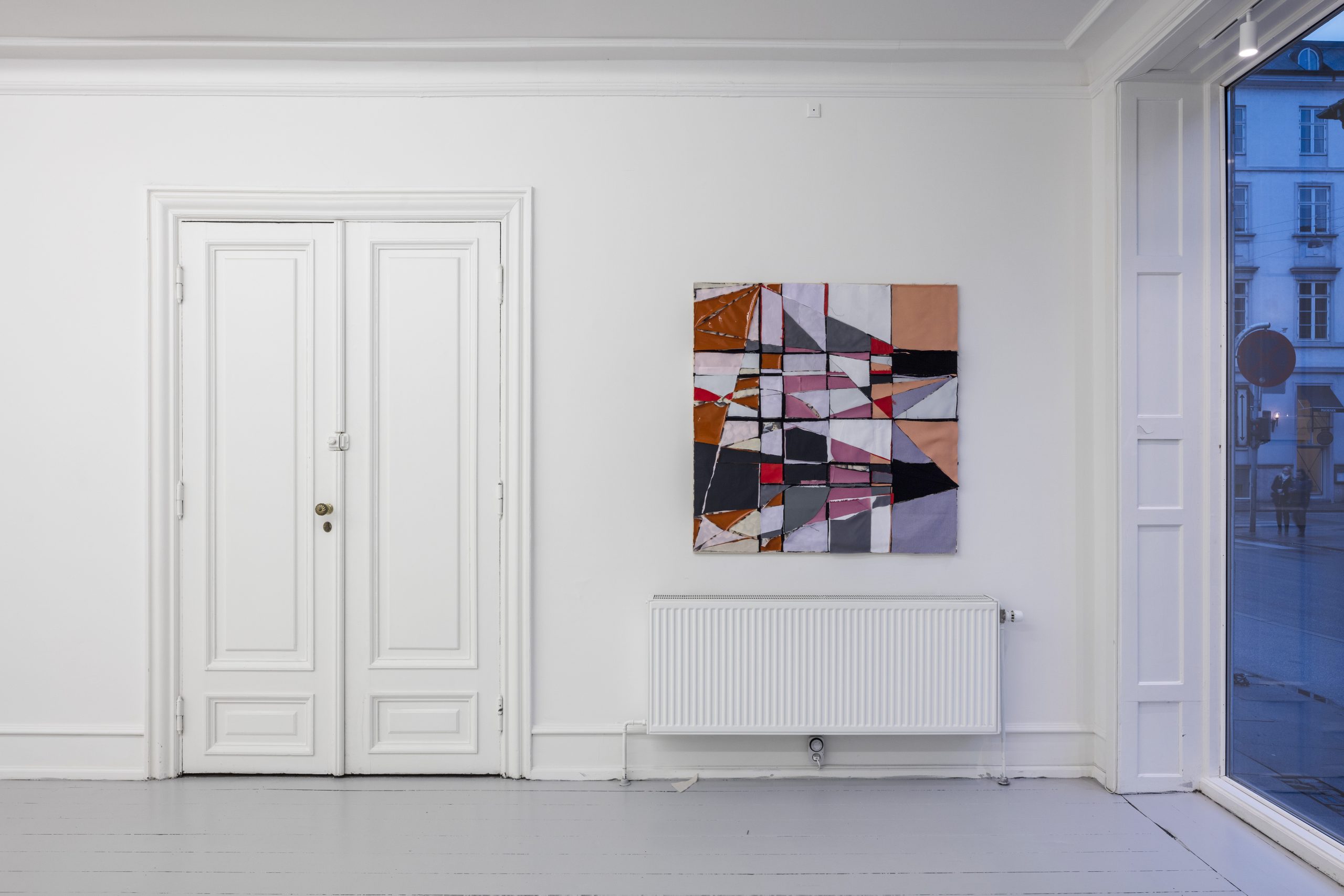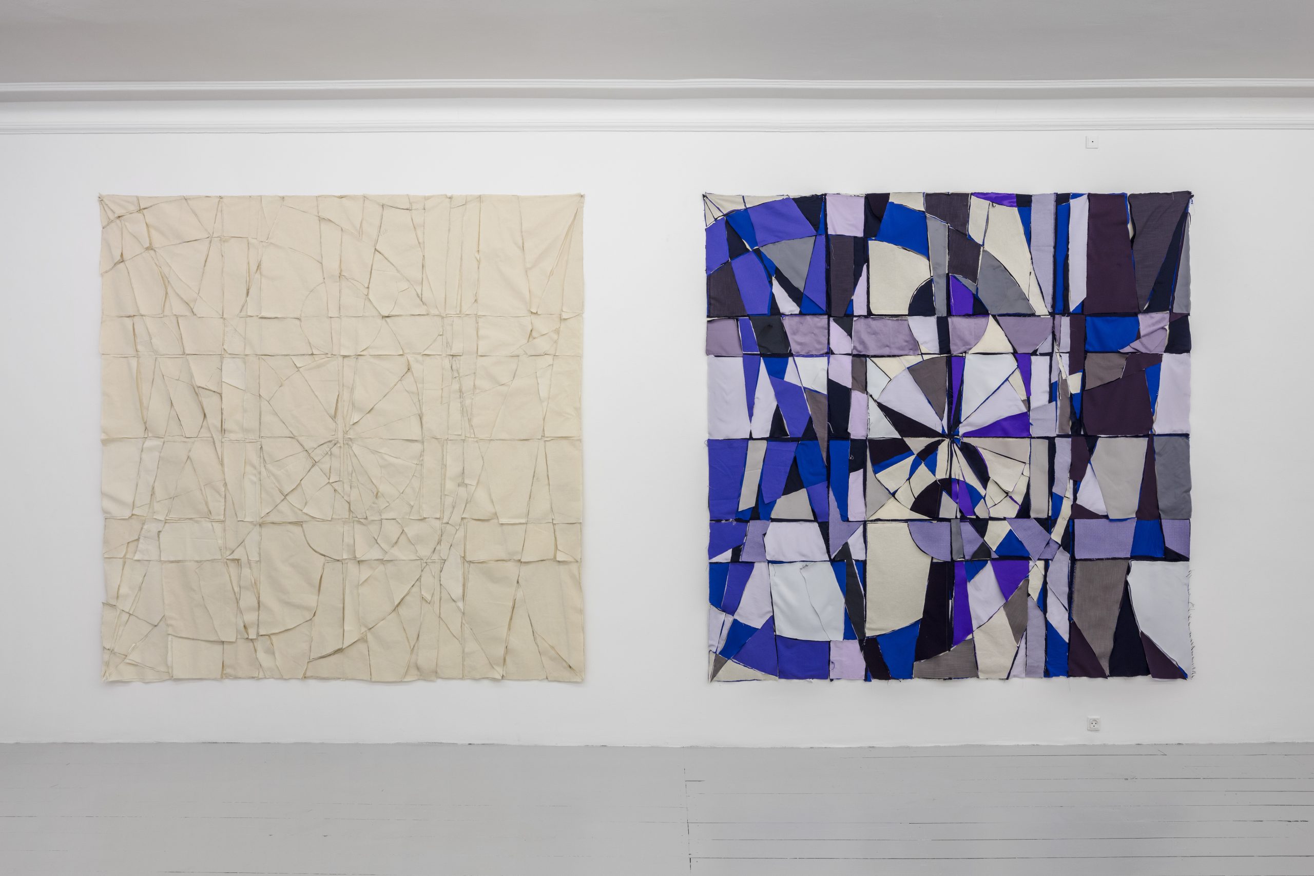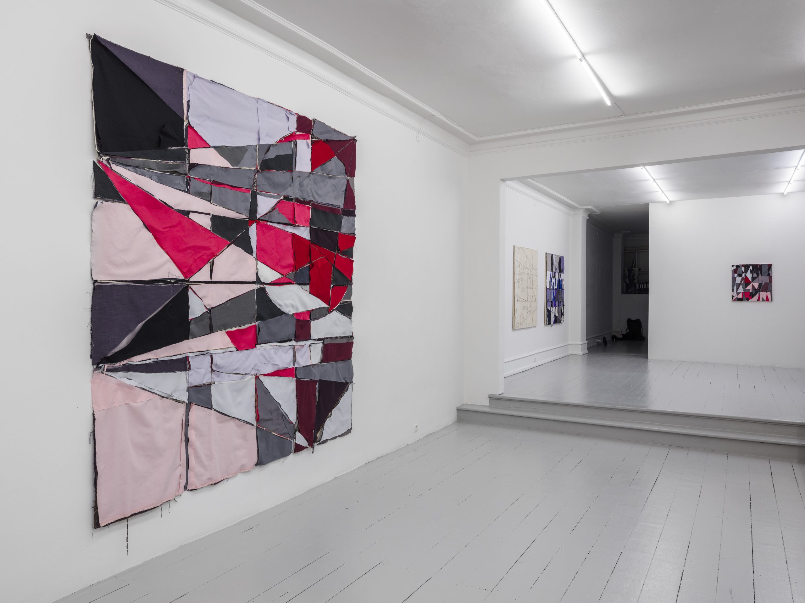 I udstillingens værker er stykker af allerede bearbejdet, vævet og indfarvet stof klippet og revet ud af sin oprindelige sammenhæng, for derefter at blive samlet i en ny sammenhæng, en konstruktion, der tager udgangspunkt i en form for grid. Dette grid er dannet ud fra det enkelte værks eget mål og i hvert værk håndteres dette udgangspunkt forskelligt. Collagernes overflade lader ingen tvivl tilbage om netop håndens fysiske nærvær. Folder, flossede kanter og lagdelte opbygninger afstedkommer og manifesterer rytme og repetition, og I udstillingens både mindre koncentrerede og større monumentale værker rækkes ud efter hele kroppen.